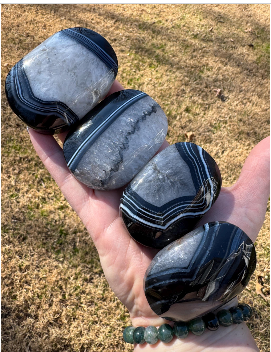 Stunning black agate mixed with Clear Quartz Palm Stones. These have a hefty weight to them. Each stone is between 2”- 3” long. Every order from Moonlit Day Apothecary will be gift wrapped with my signature wax seal.