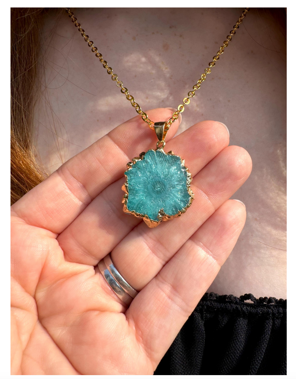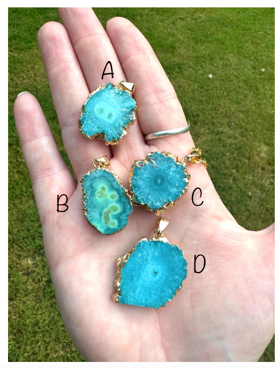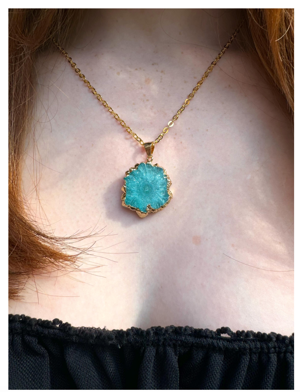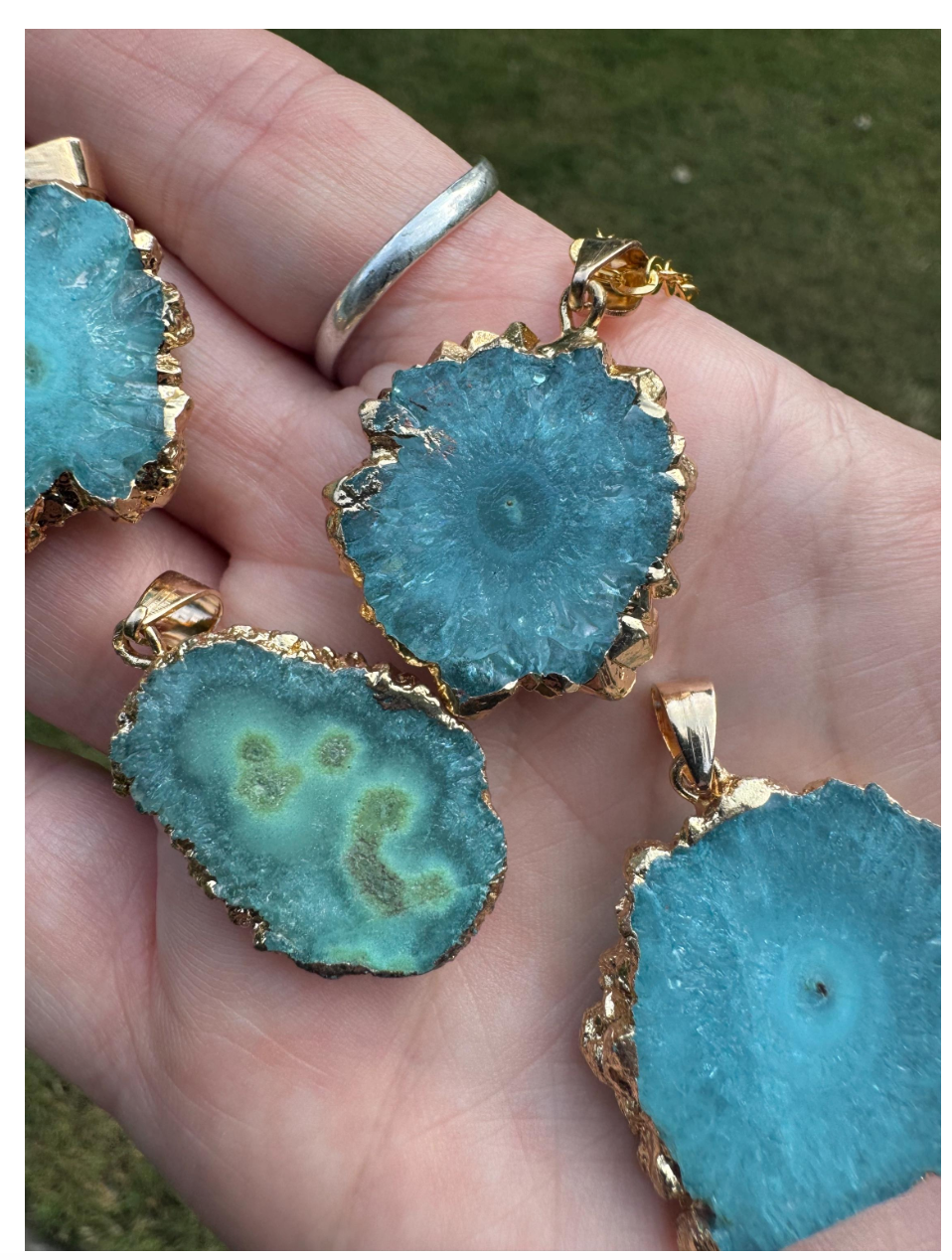 Pretty blue dyed agate slice pendants. Sturdy pendants dipped in gold are aprox 1” long and 1” wide. Will be sold on a 22” gold chain. Free gift wrap with the Moonlit Day Apothecary signature wax seal for every order. You can follow moonlit Day Apothecary on TikTok, Instagram, and FB.