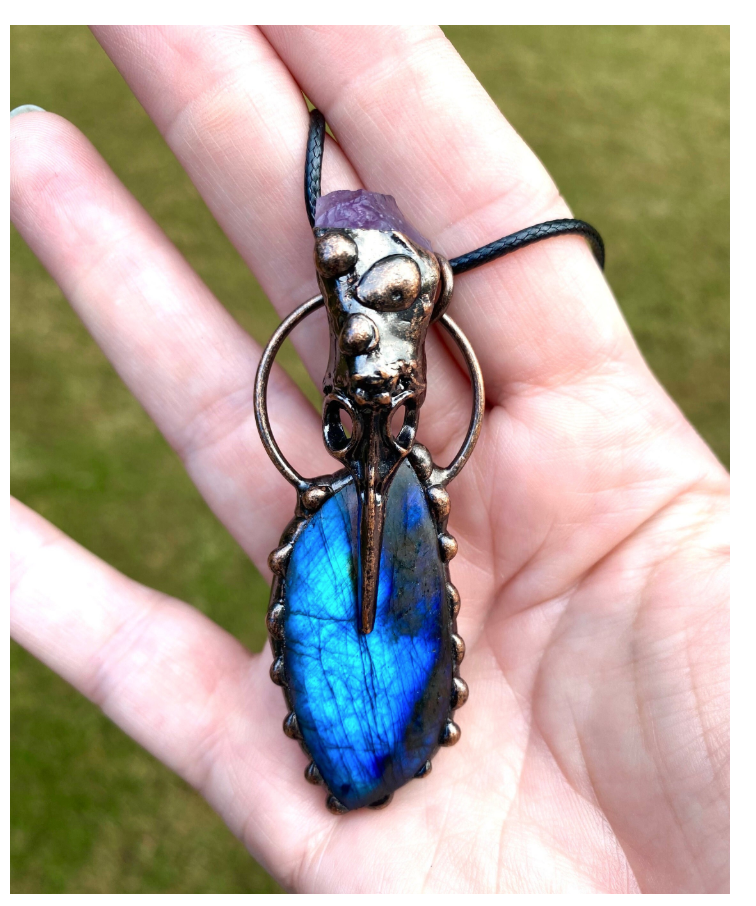 Hand made copper pendant of a raven/crow with amethyst skull and flashy labradorite. Sturdy pendant is aprox. 3” long and 1” wide. A unique statement piece. Will be sold on a faux leather 18” chain. Free gift wrap with the Moonlit Day Apothecary signature wax seal for every order. You can follow moonlit Day Apothecary on TikTok, Instagram, and FB.