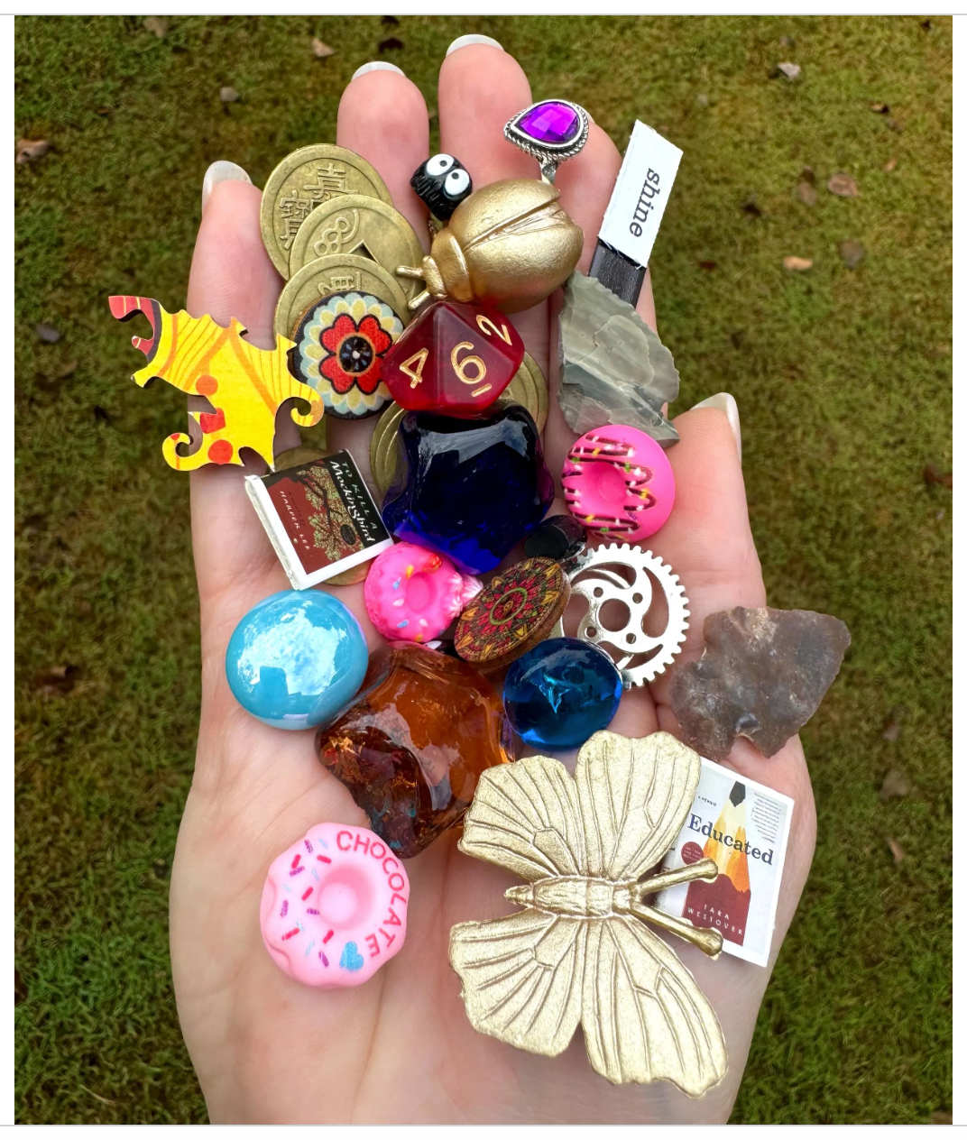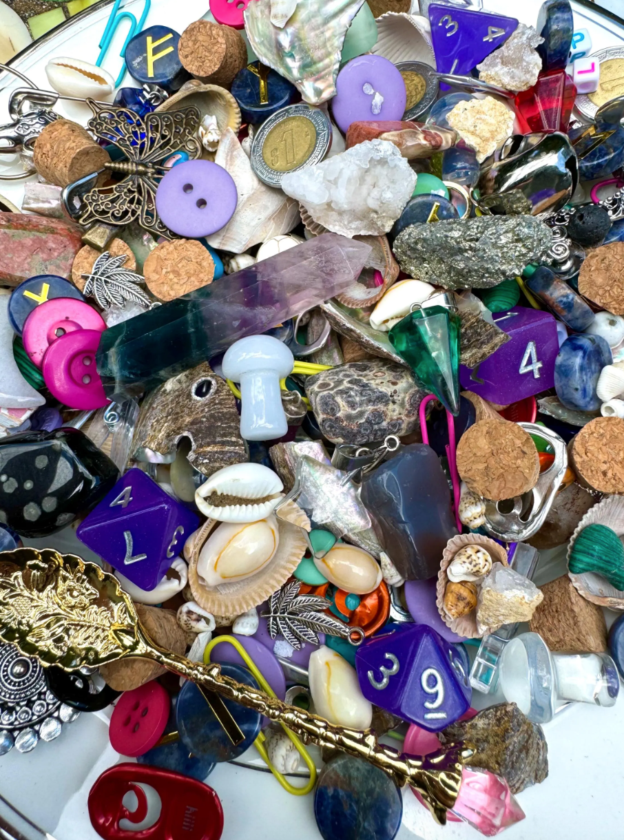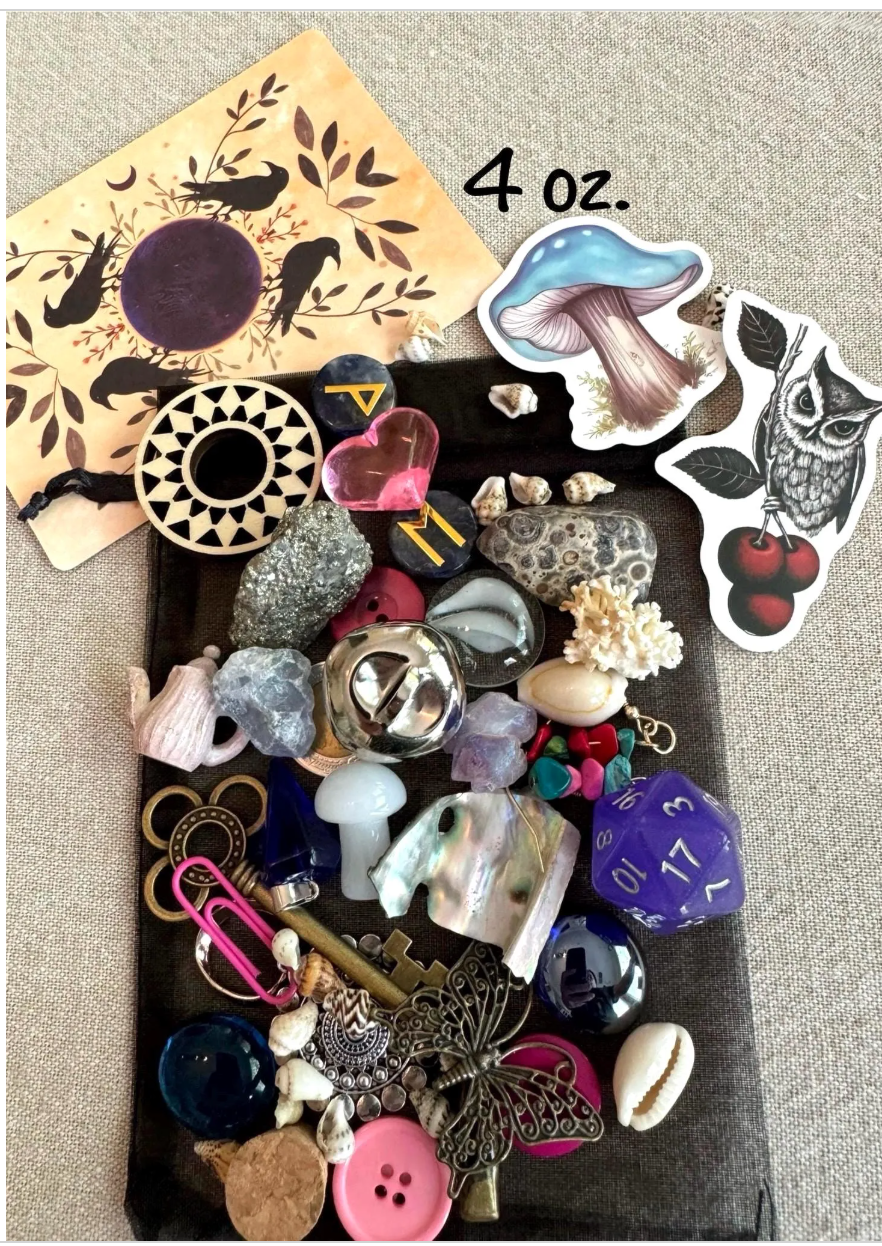 Crow treasure! Have you ever befriended a crow or raven? Maybe left out peanuts for your feathered friends and they left you a sparkly gift as thanks? It really happens! I’ve created confetti scoops for those who love little trinkets and sparkly rocks. Think colorful little treasures you might find in a child’s pocket at the end of a day playing outdoors. My Crow Treasure Scoops come in 4oz and 8oz bag options. These are little trinkets a crow could carry so there are several items in each order.