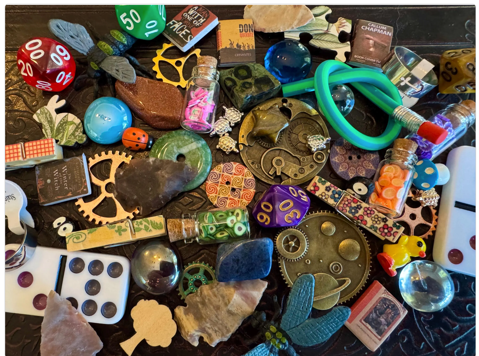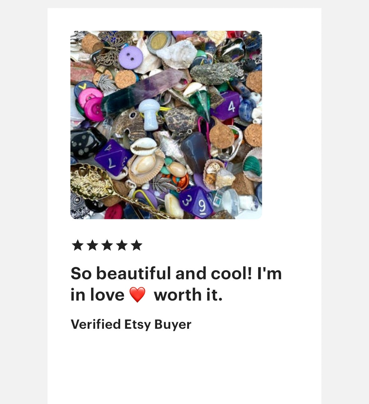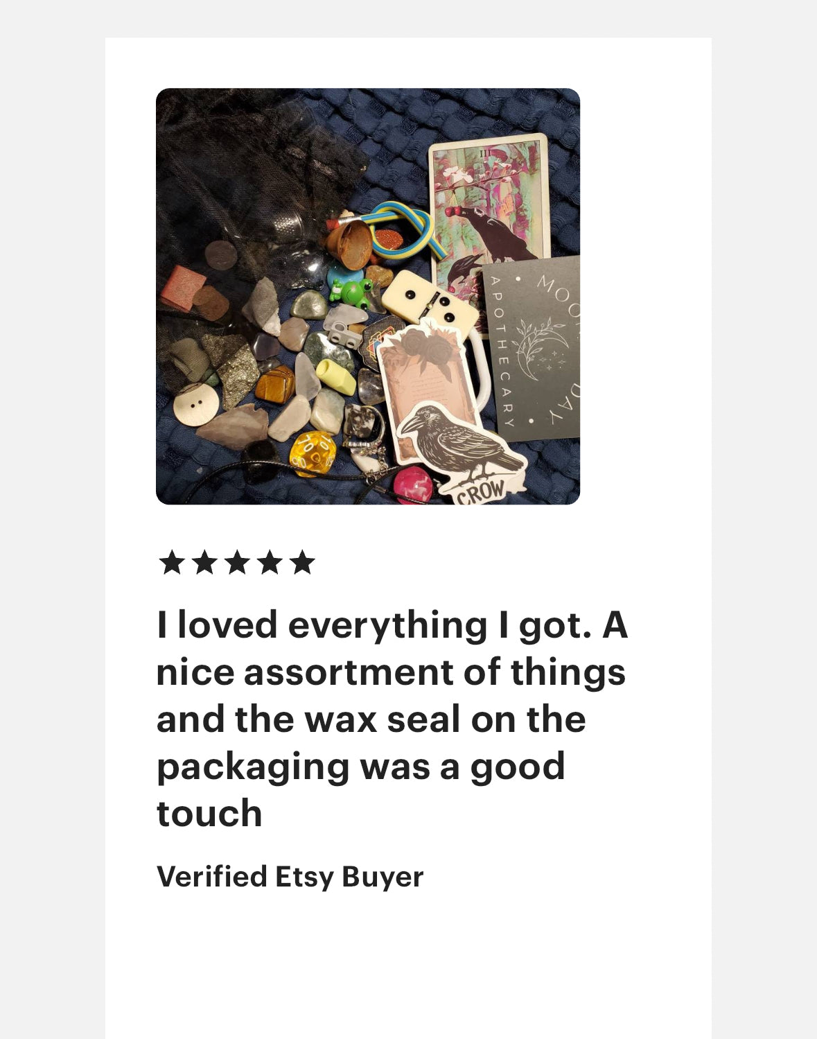 Crow treasure! Have you ever befriended a crow or raven? Maybe left out peanuts for your feathered friends and they left you a sparkly gift as thanks? It really happens! I’ve created confetti scoops for those who love little trinkets and sparkly rocks. Think colorful little treasures you might find in a child’s pocket at the end of a day playing outdoors. My Crow Treasure Scoops come in 4oz and 8oz bag options. These are little trinkets a crow could carry so there are several items in each order.