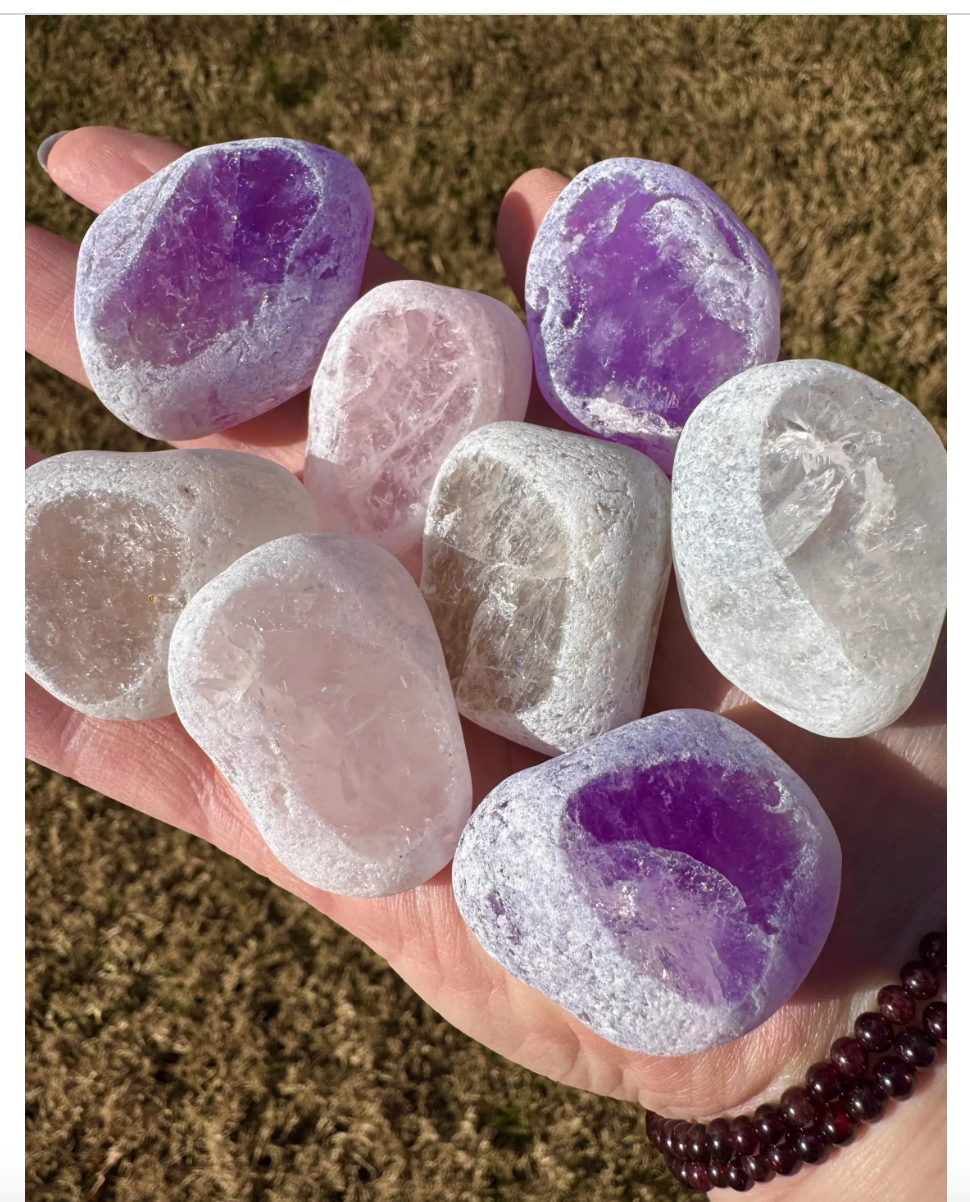 Gorgeous Ema Eggs from Brazil. Each is between 1.5”-2.5”. These are natural stones rolled smooth in the Ema River in Brazil, then cut to show a “window”. They make a lovely gift. Every order from Moonlit Day Apothecary is gift wrapped with my signature seal at no extra charge.