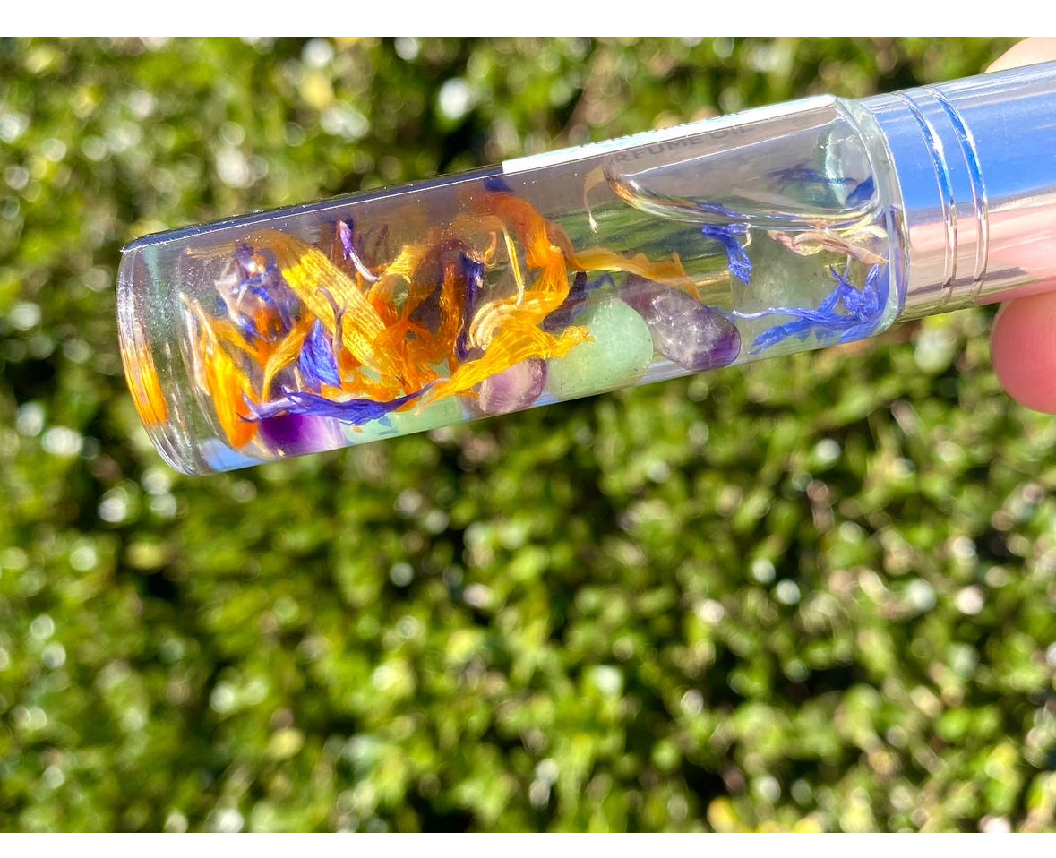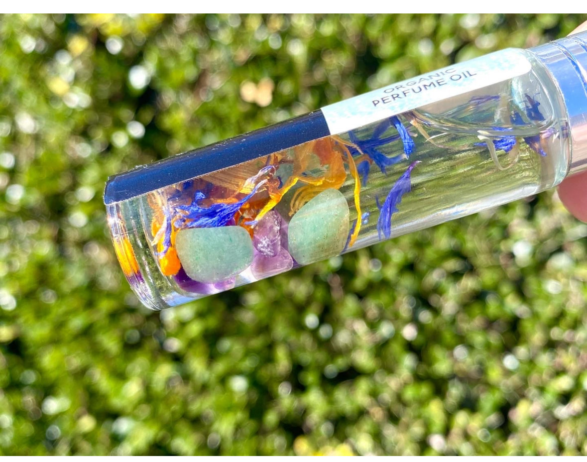 Inside the 10ml roller I have placed brilliant blue organic cornflower, healing organic yellow calendula petals, green aventurine, and deep purple amethysts. These crystals infuse your perfume with the spirit of adventure, a bit of luck, and the kind emotional healing only nature can provide.
