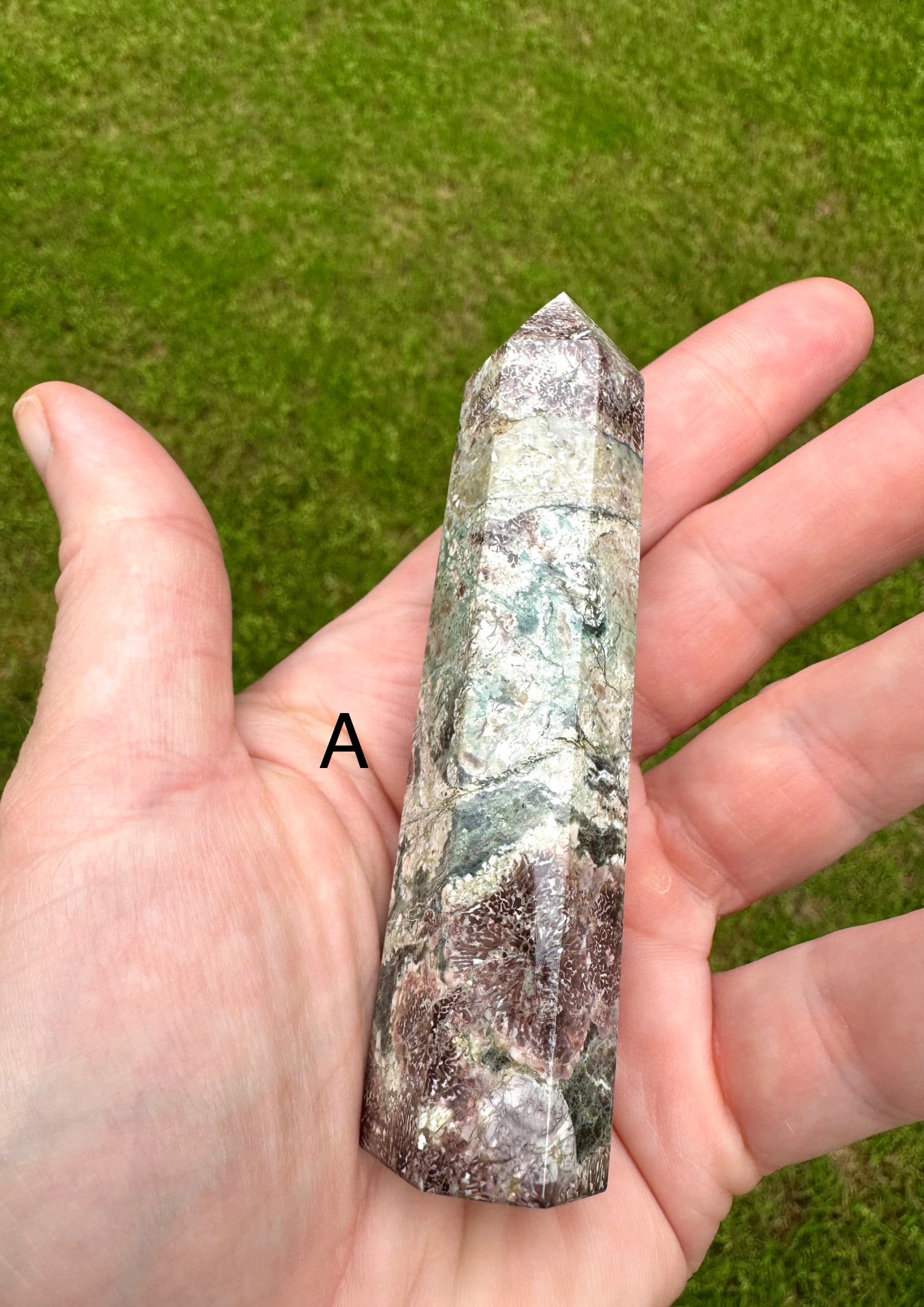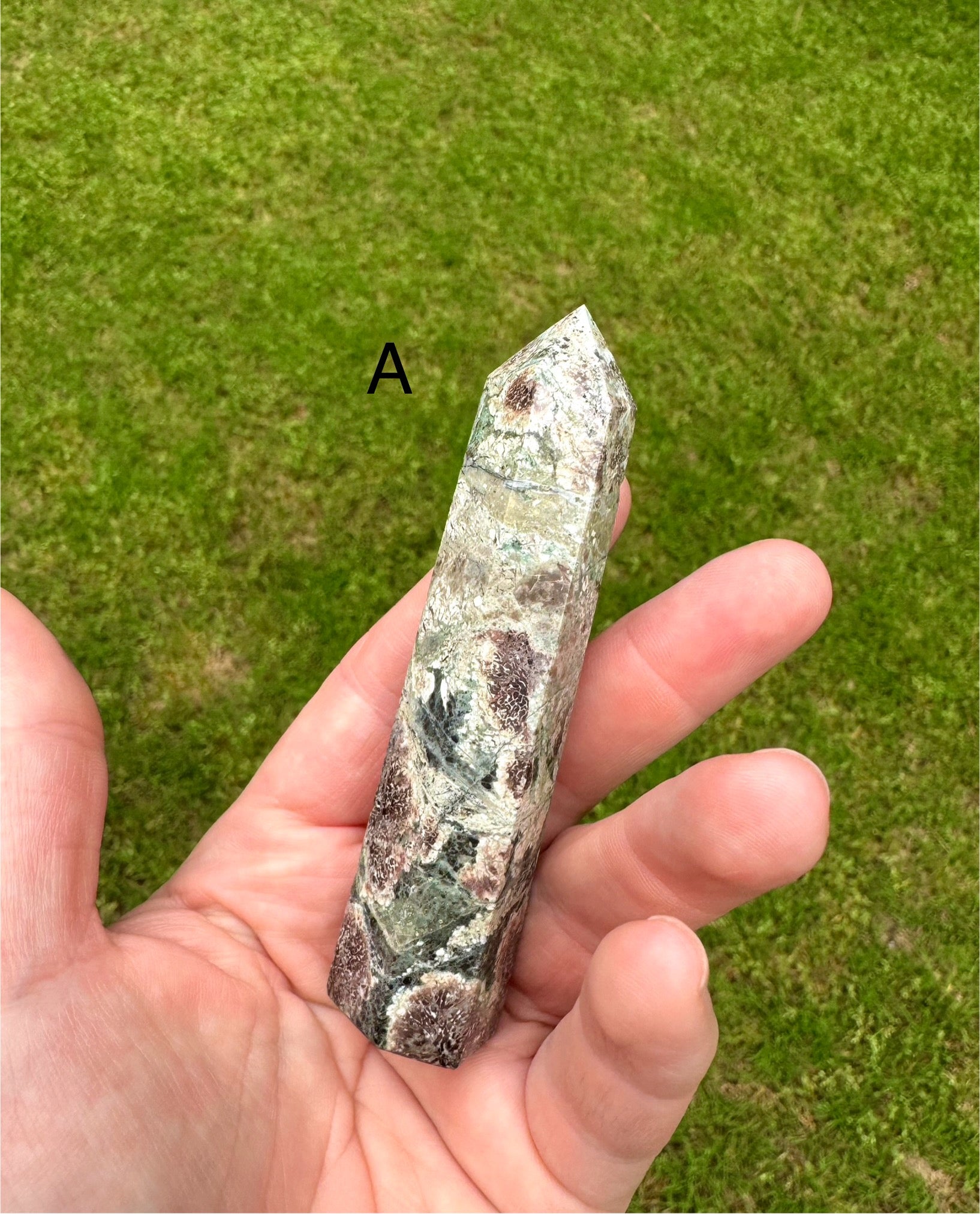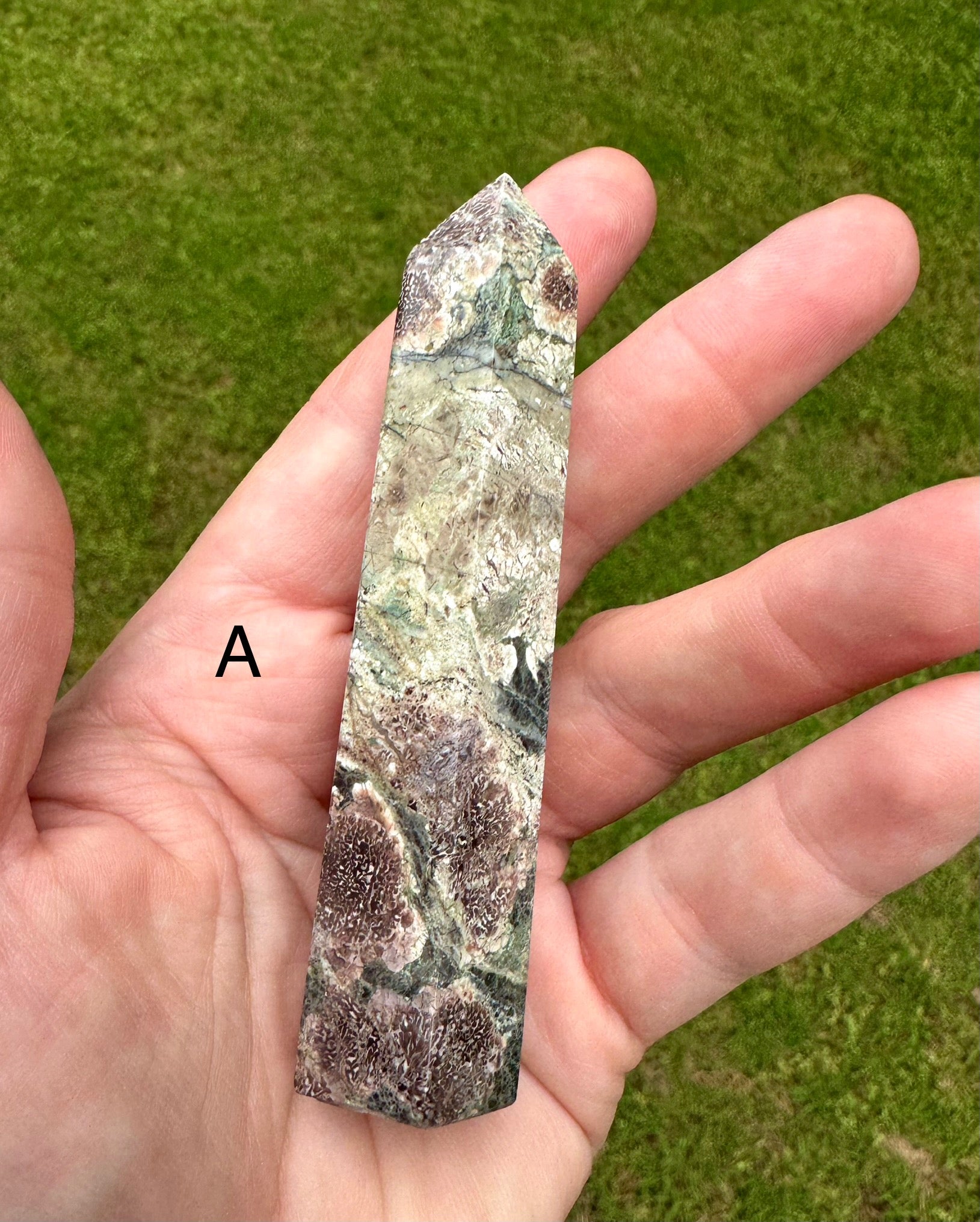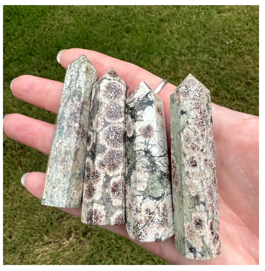 Lovely Green Sakura Flower Agate tower. 3.75” tall. Sakura Agate is full of soft, nurturing energy and promotes harmony and balance. Letter A is the current option. Every order from Moonlit Day Apothecary will be gift wrapped in my signature wax seal making an excellent presentation for gift giving.