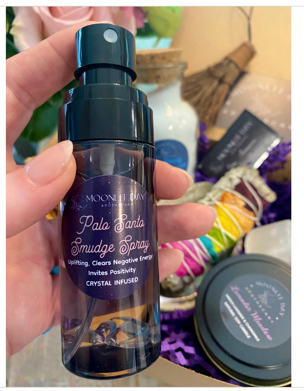 *Palo Santo Smudge Spray. This spray is filled with pure essential oils of palo santo, sage, and rosemary. It leaves a stagnant room fresh and clean smelling. It is infused with quartz crystals. Shake well before spraying.