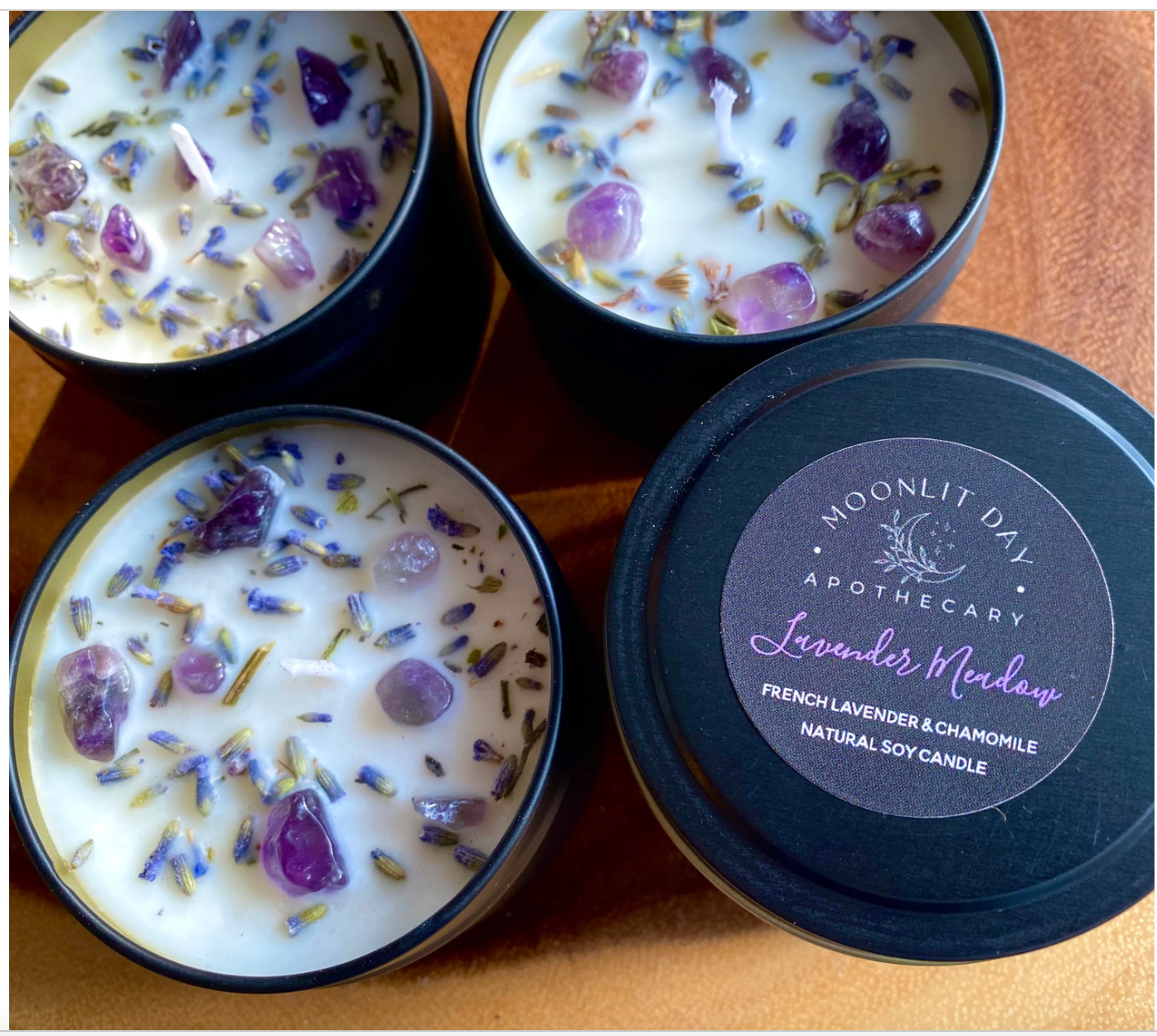 My Lavender Meadow candles will remind you of a warm, relaxing Summer afternoon. The Sun is shining and a soft breeze is scented with French Lavender and a hint of Chamomile. Each 5 oz. candle tin is topped with amethyst chips, and organic french lavender buds. All essential oils, and botanicals are organic.