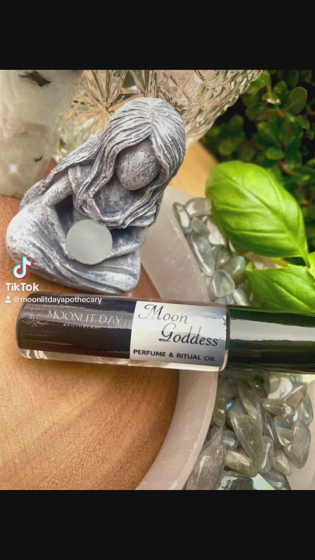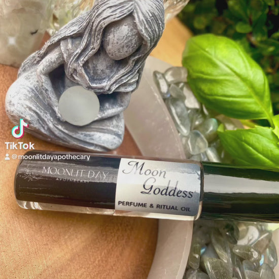 Selene, Greek Goddess of the Moon, and matron of dreamers, witches and moon-gazers. In Roman rule, she would be known as Luna. An amorous and gentle goddess, she can calm emotional stress and help you find power in your more feminine energies. Perfect for full moon rituals. I have scented my Moon Goddess perfume with Neroli, Lily, and a hint of night blooming Jasmine. Fresh, clean, and sexy. Inside the 10ml glass roller bottle are luminous grey moonstones and clear quartz to amplify your intentions. Wear this scent as perfume or to dress ritual candles while performing lunar magick. You can also find this scent in my Selene Moon goddess candles.