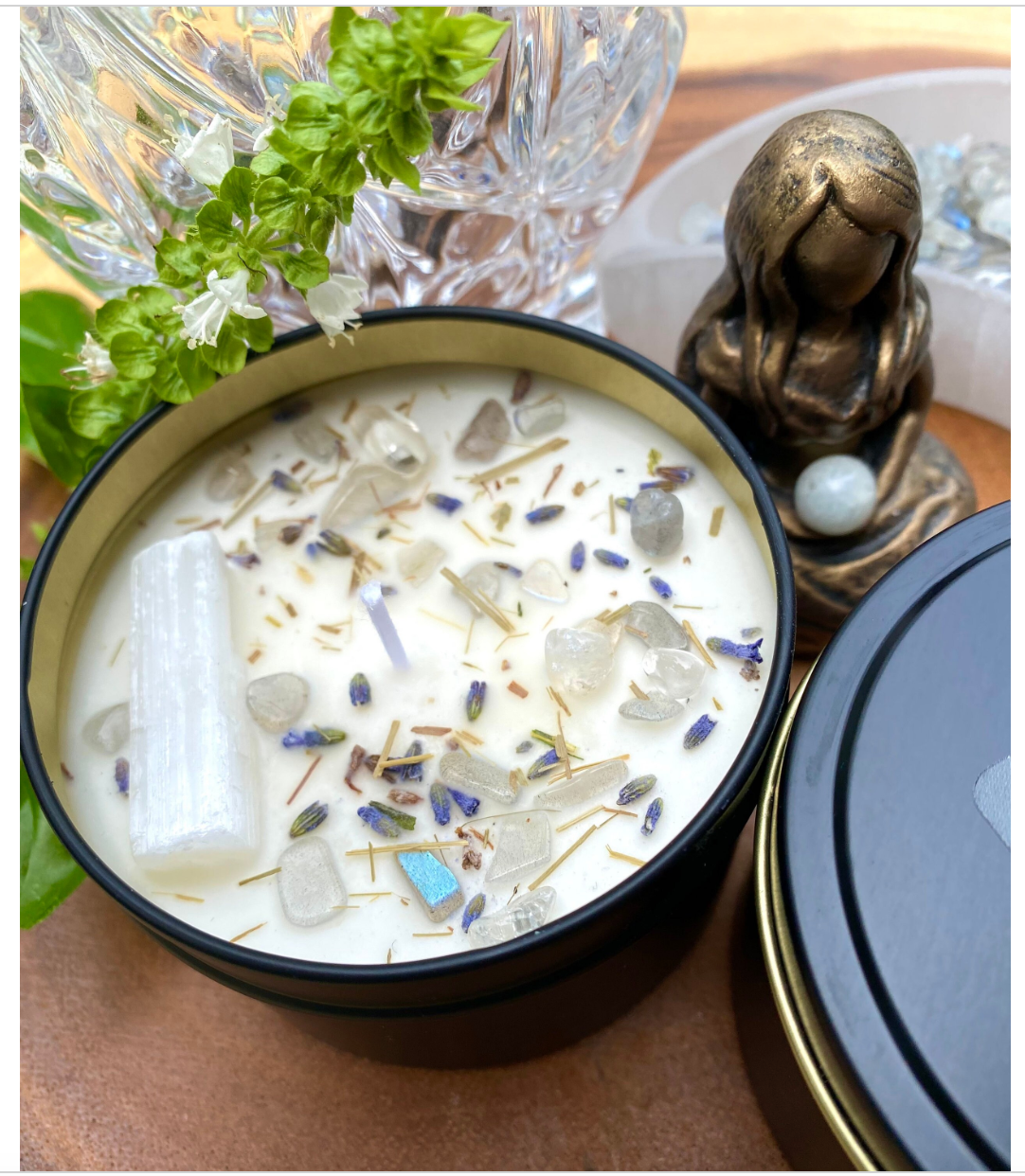 Selene, Greek Goddess of the Moon, and matron of dreamers, witches and moon-gazers. In Roman rule, she would be known as Luna. An amorous and gentle goddess, she can calm emotional stress and help you find power in your more feminine energies. Perfect for full moon rituals. I have scented my Selene candles with Neroli, Lily, and a hint of night blooming Jasmine. Fresh, clean, and sexy. These candles are topped with grey moonstones, organic lavender buds and lemongrass, along with a stick of Selenite. Selenite is known to help clear your mind and elevate your spirit. As always, never leave your candle unattended.