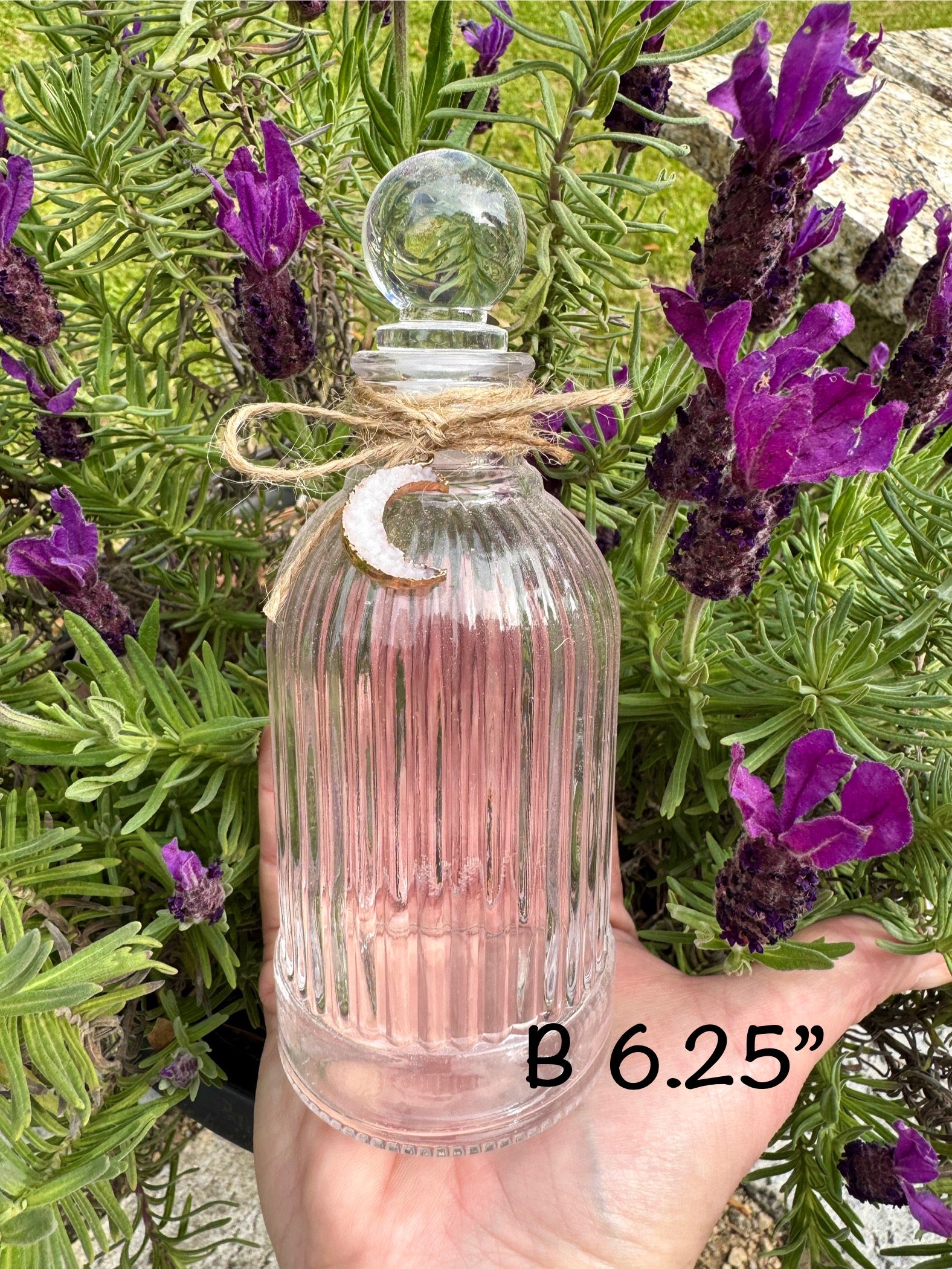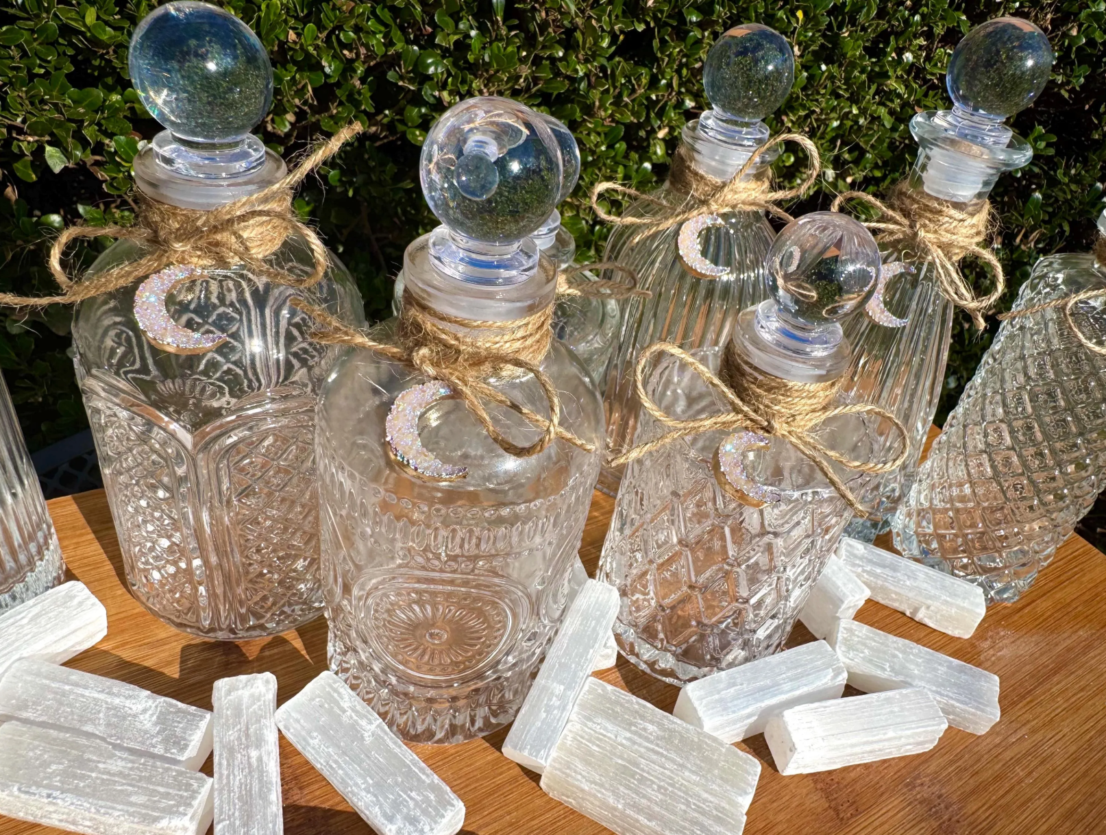 The glass bottles range in style so you get to choose which one calls to you. Each bottle has a small removable sparkly moon pendant you can wear during lunar rituals or anytime you wish. Each bottle comes with its own selenite stick. (Do not submerge selenite in water). These are sturdy little jars and will be carefully gift wrapped ready to present to your moon loving friends or as a lovely addition to your own home.