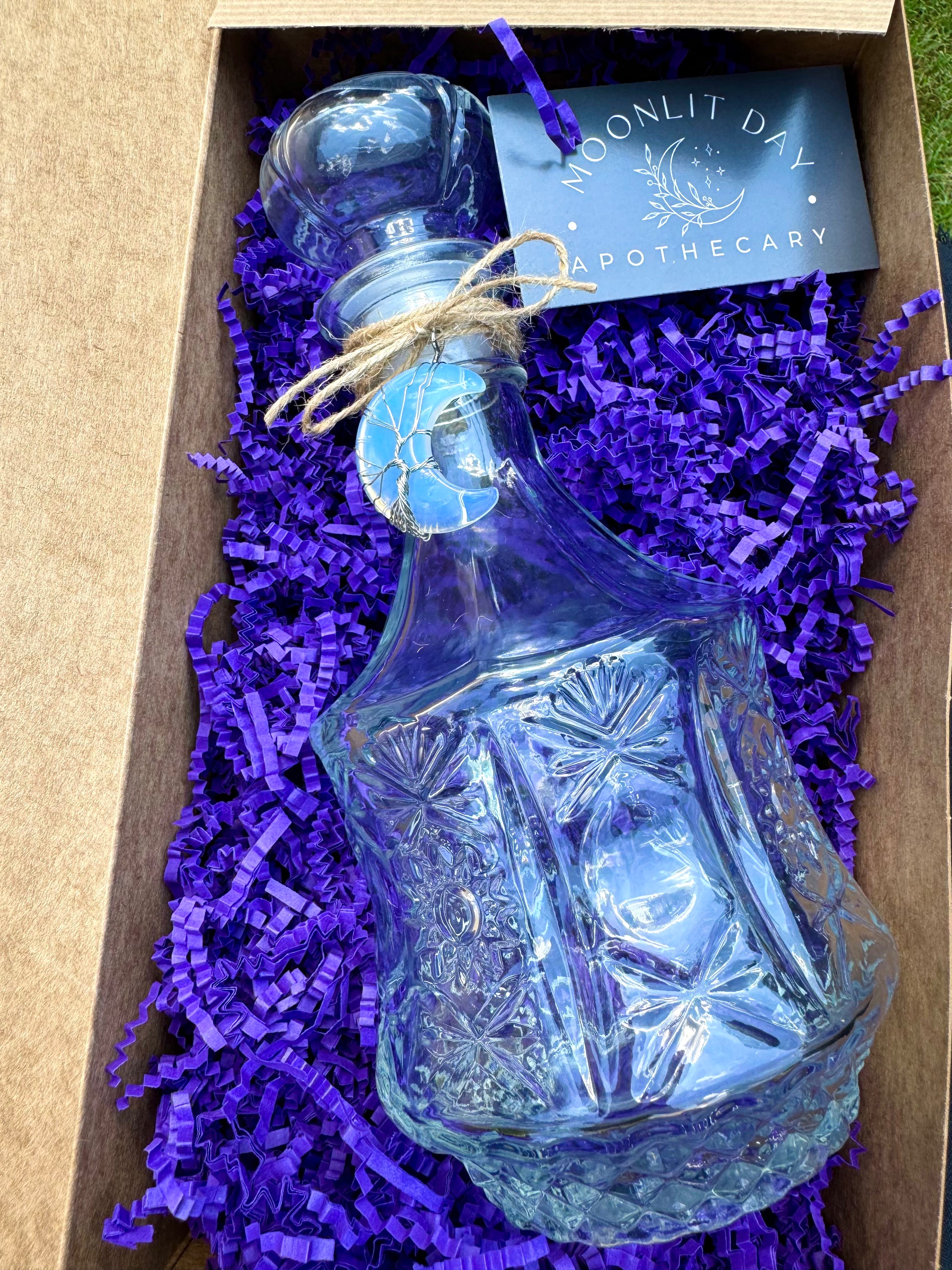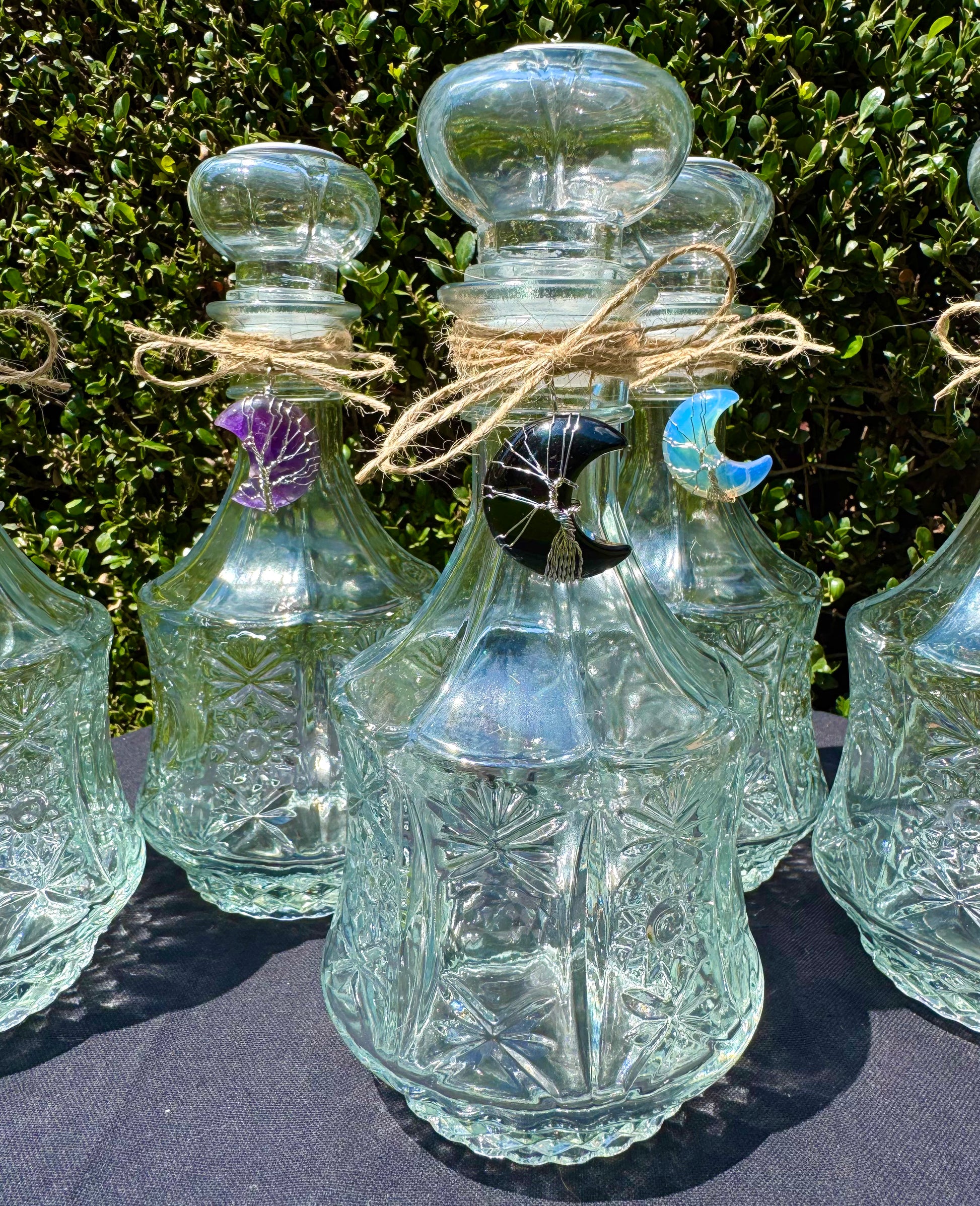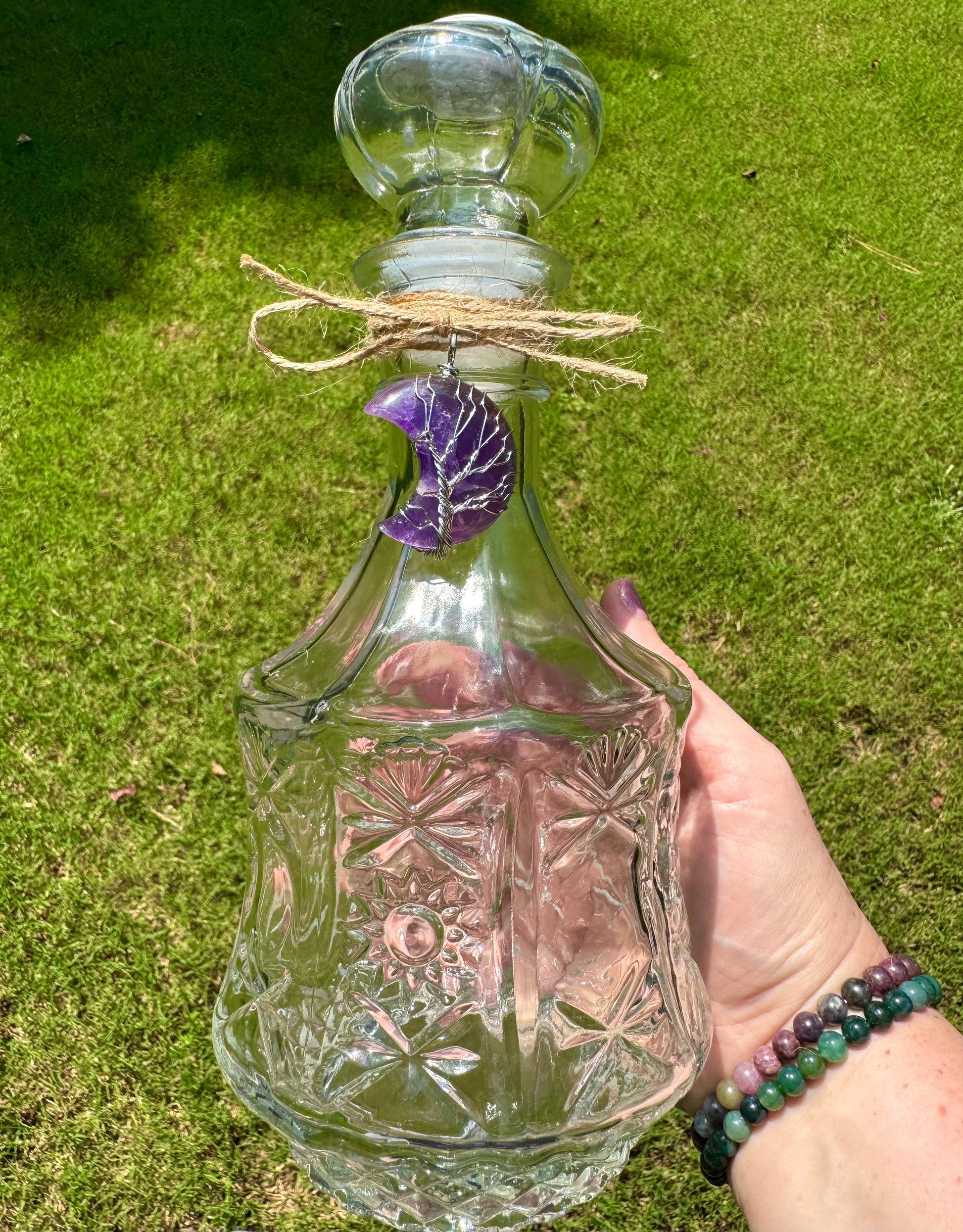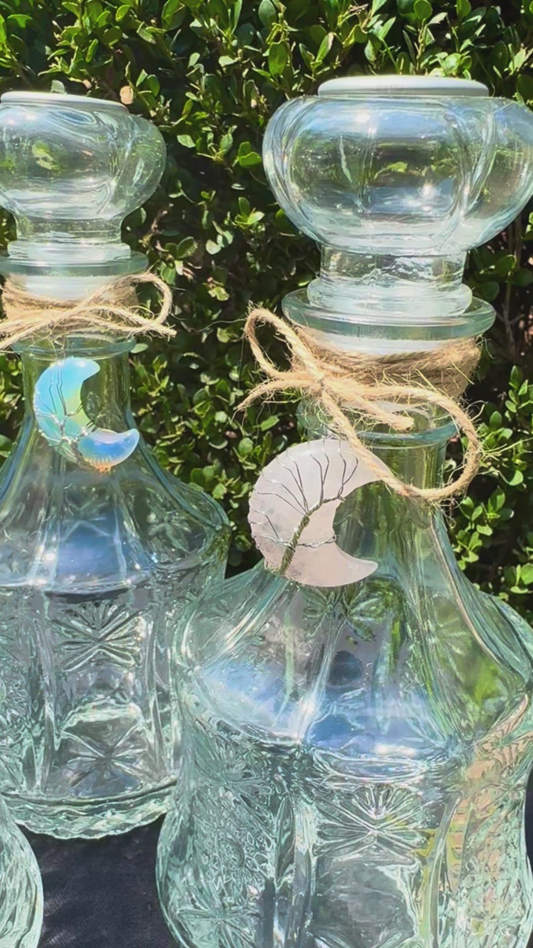 Gorgeous Glass Moon Water Bottles, 10” tall. Holds 33 oz. Sturdy and food safe. Topped with the Moonlit Day Apothecary wax seal. Each bottle has a removable, real crystal moon pendant of your choosing that you can wear during lunar rituals or anytime you wish. You get to choose the natural crystal moon. These bottles will be beautifully wrapped ready for gift giving.