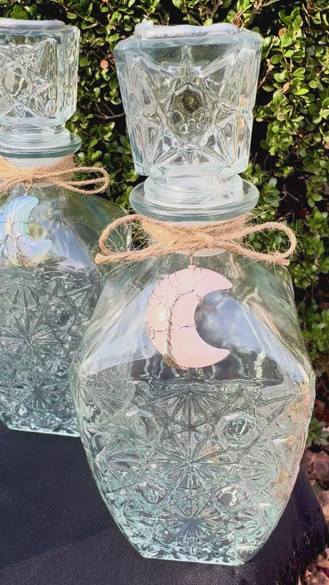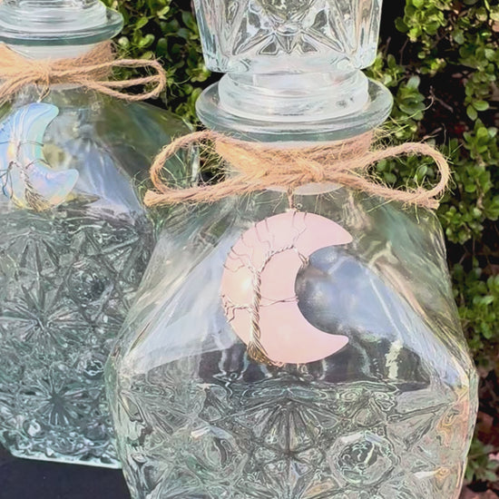 Gorgeous Glass Moon Water Bottles, 10” tall. Holds 26 oz. Sturdy and food safe. Topped with the Moonlit Day Apothecary wax seal. Each bottle has a removable, real crystal moon pendant of your choosing that you can wear during lunar rituals or anytime you wish. You get to choose the natural crystal moon. These bottles will be beautifully wrapped ready for gift giving.