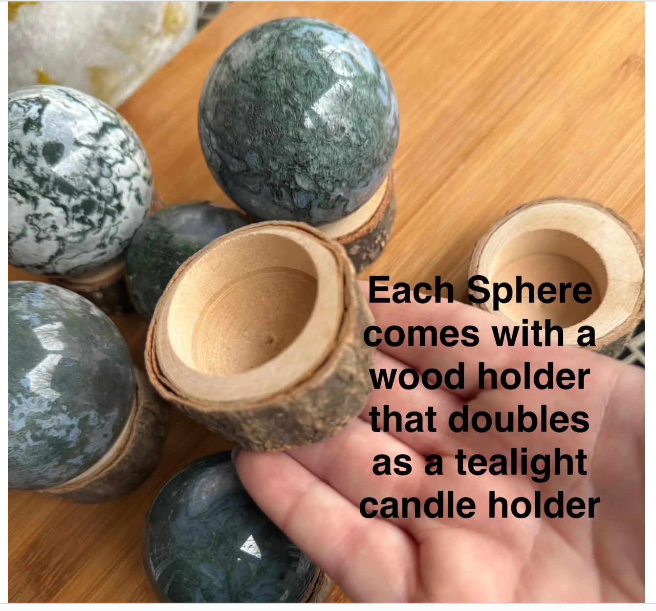 Stunning Moss Agate Spheres. Carved of natural Moss Agate. Moss agate is one of my favorite crystals. It symbolizes happiness, abundance, growth and prosperity. Each of these lovely spheres measures at least 2” up to 3”. Plus, every sphere comes with a natural wood holder that doubles to hold tea light candles. Each sphere varies greatly in color, pattern and size so you get to choose! Makes a thoughtful gift. Every order from Moonlit Day Apothecary is gift wrapped in the MDA signature wax seal. You can follow Moonlit Day Apothecary on Tikik, Instagram and FB.