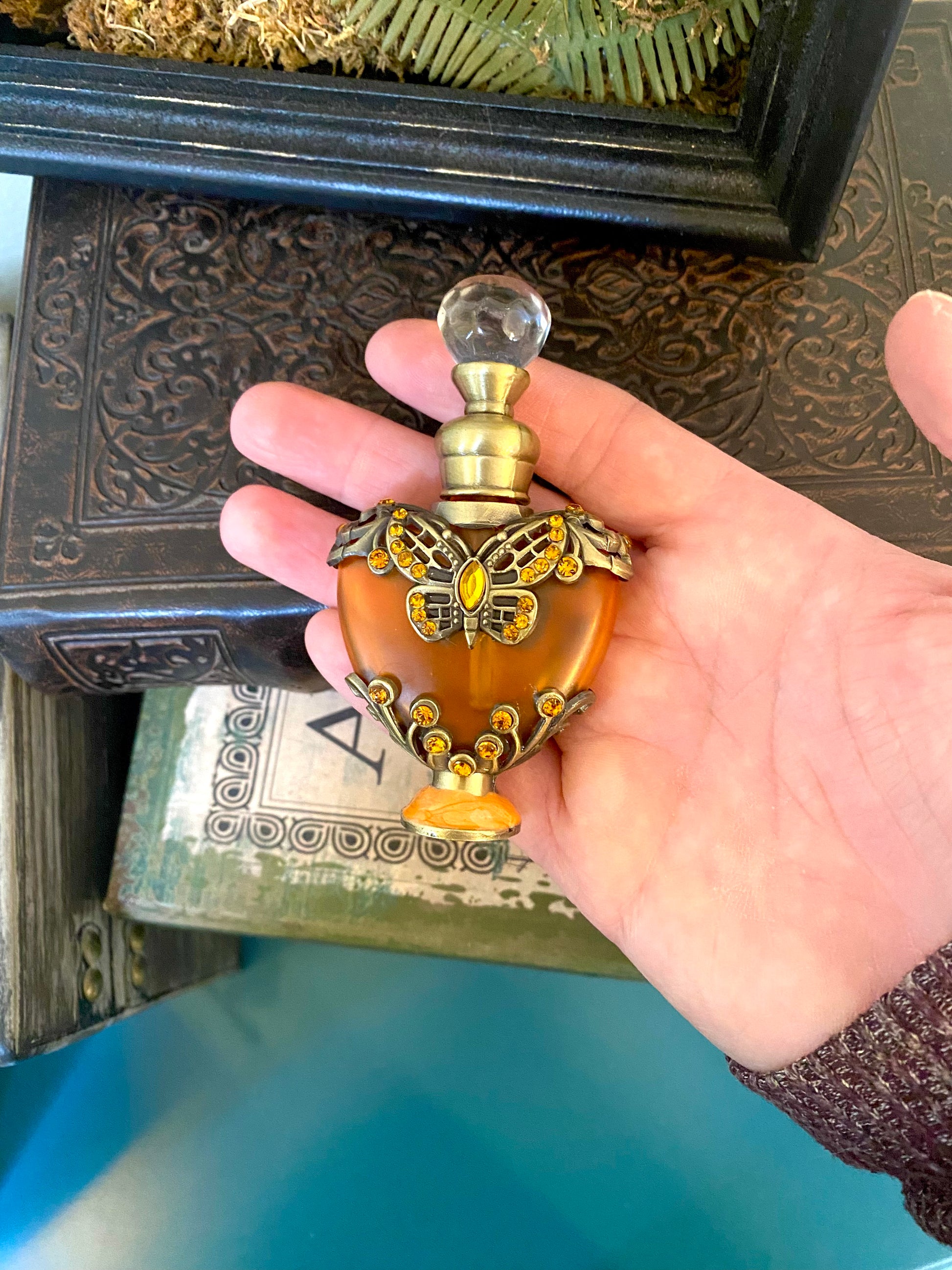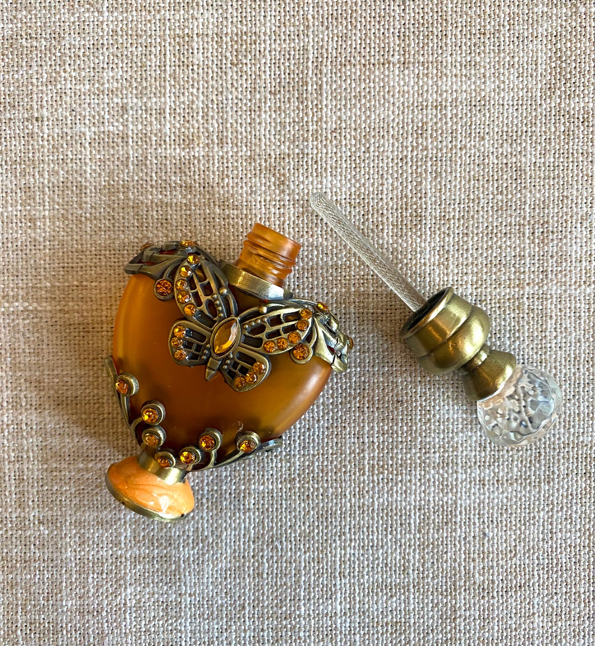 Pretty orange heart shaped perfume bottles adorned with a butterfly on the front and back. Made of metal and glass with orange rhinestones. 3.5" tall. Oil dropper application. Comes gift wrapped at no charge.