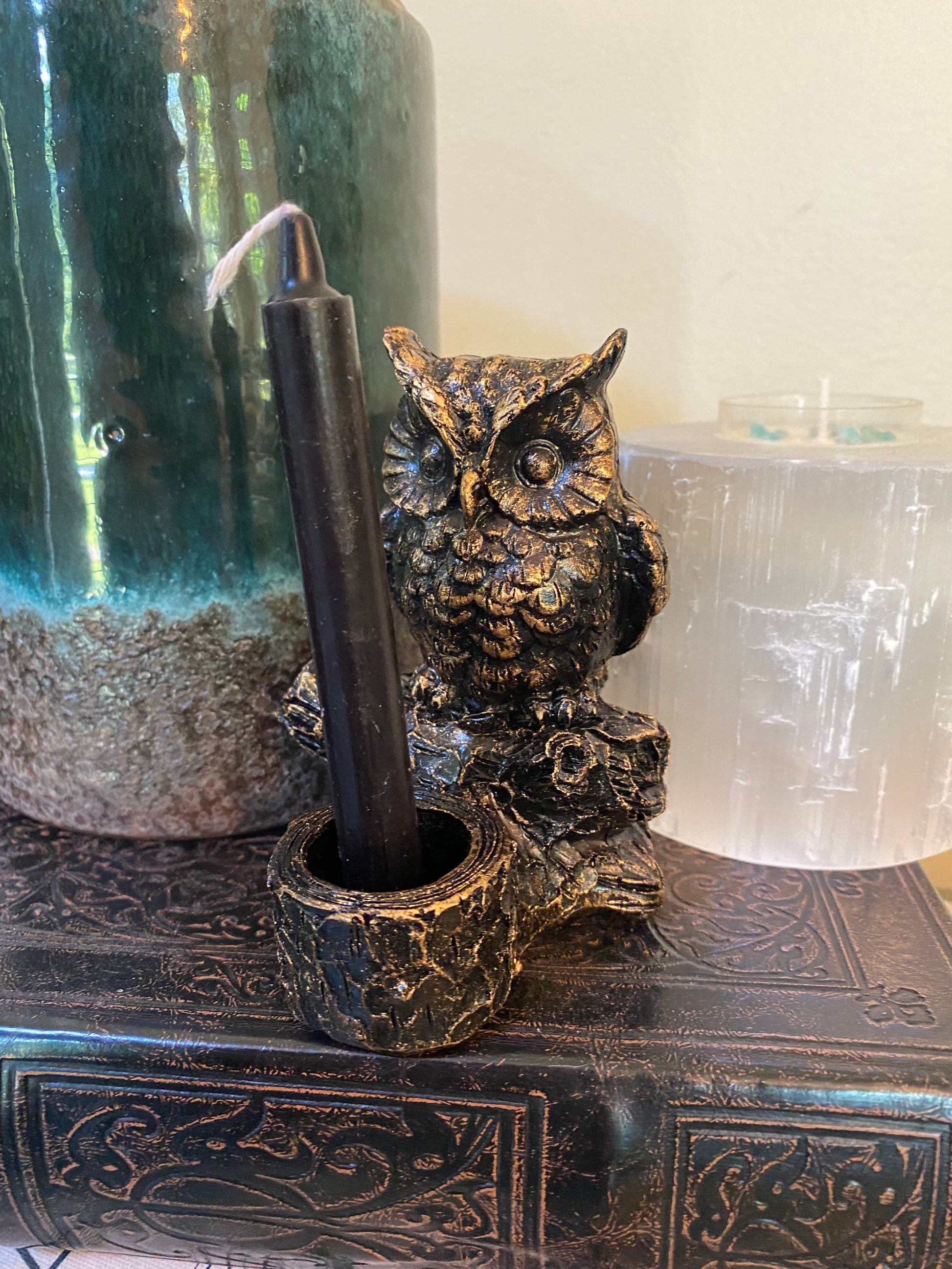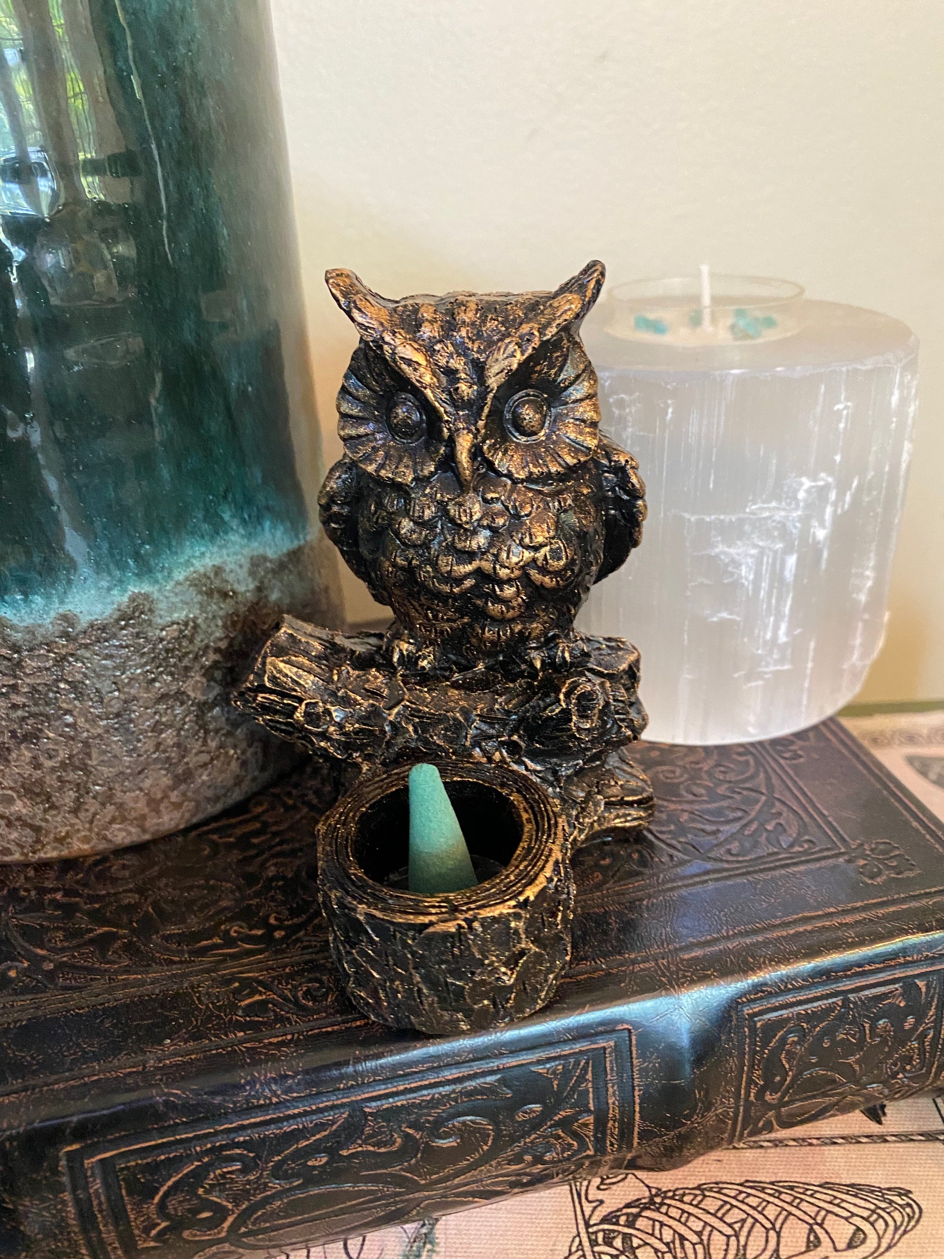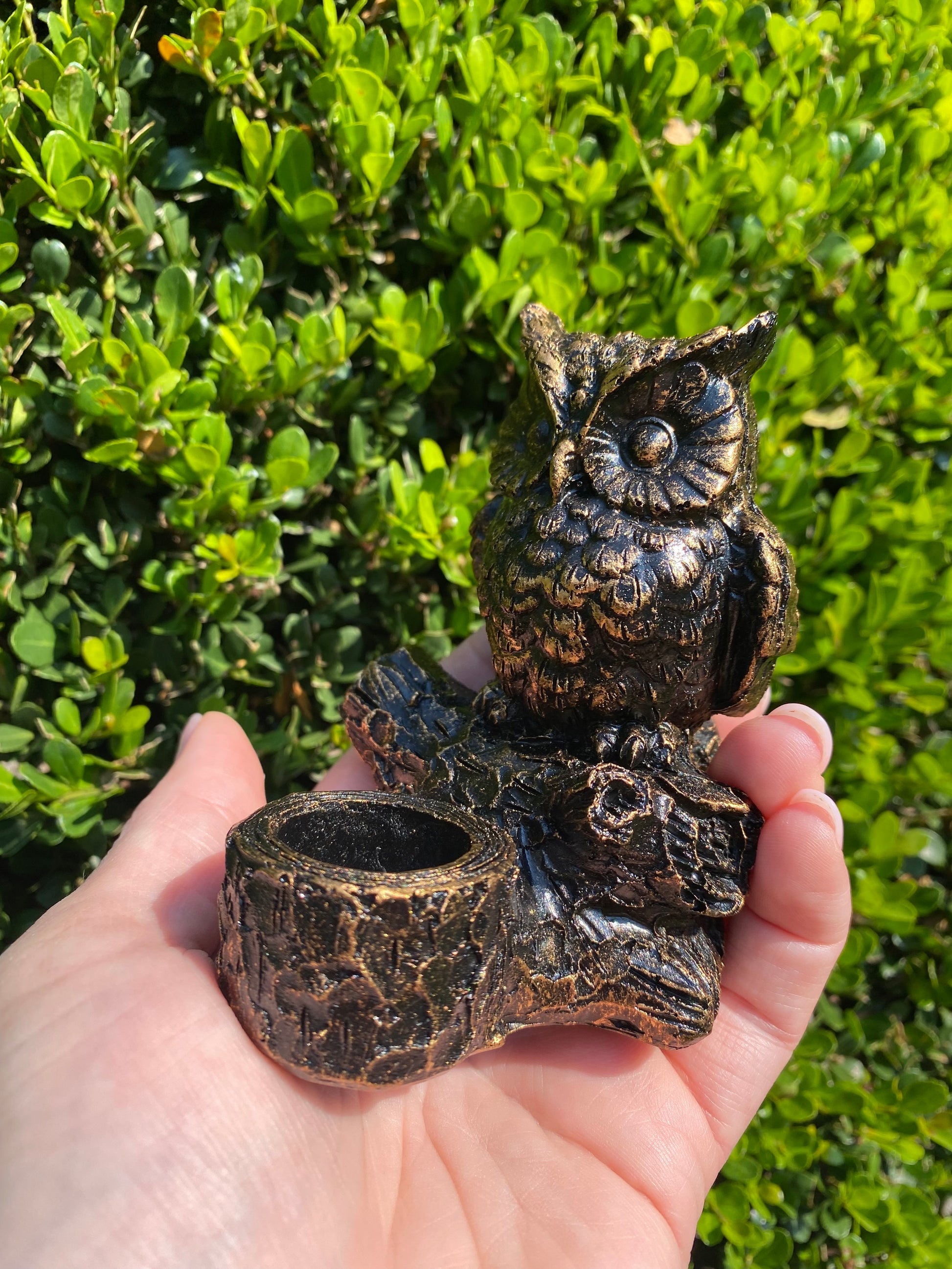 Adorable Owl on a log candle holder/incense holder. Item is made of hard resin and is 4" tall. Perfect for cone incense or spell candles. Free gift wrap with every order. Feel free to message me with questions. You can follow Moonlit Day Apothecary on Facebook, TikTok, Instagram.