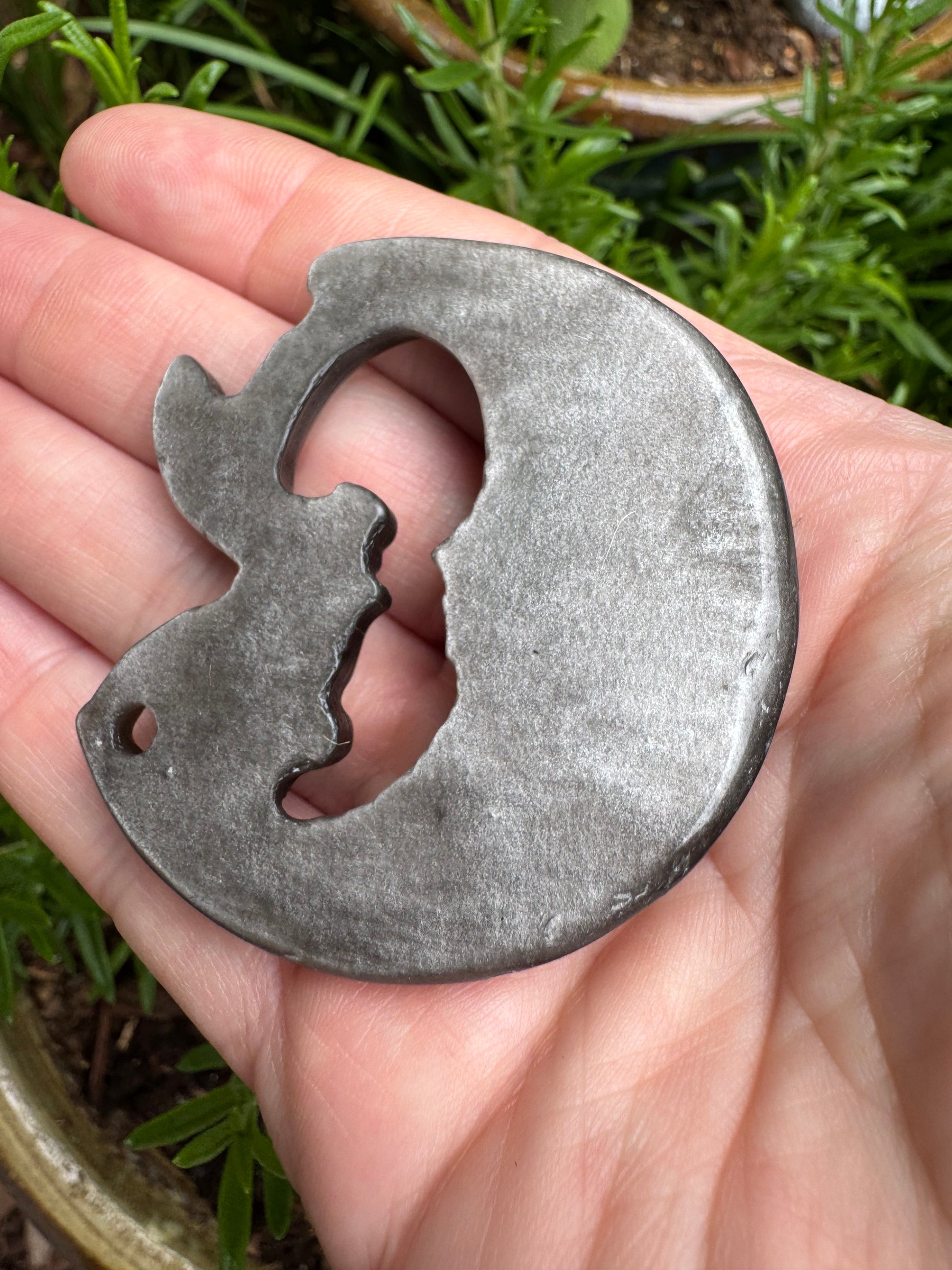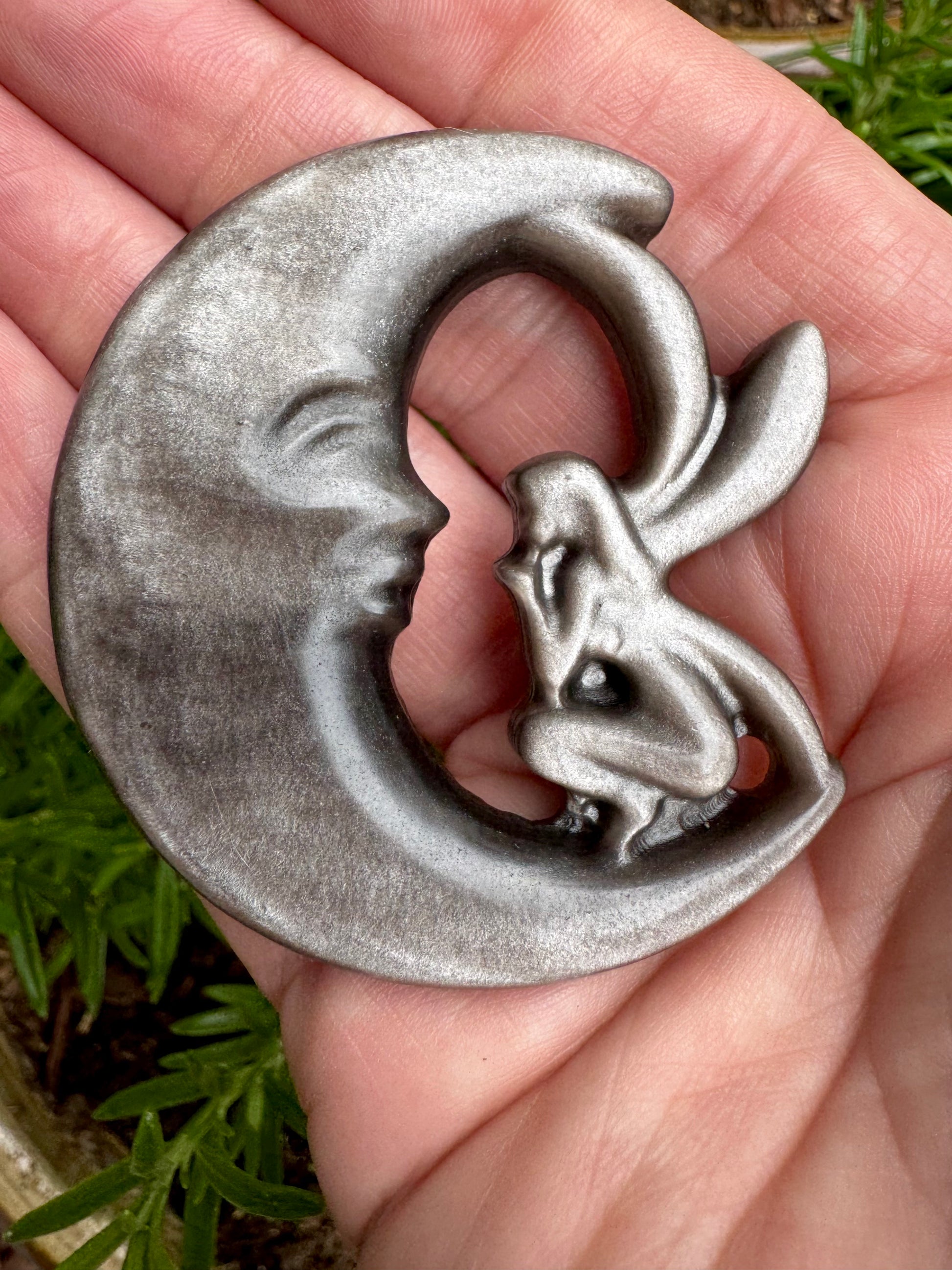 Adorable 2" natural silver obsidian carving of a moon and sweet little fairy. Will be gift wrapped at no extra charge.
